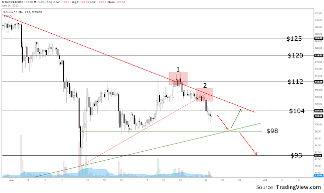 In sum, this market needs to treated with caution. If you are looking to get into Bitcoin watch for a reaction at $98 and make your decision based on what you see. Otherwise, if you need to convert back to Fiat in the short term anywhere around $104 makes sense.